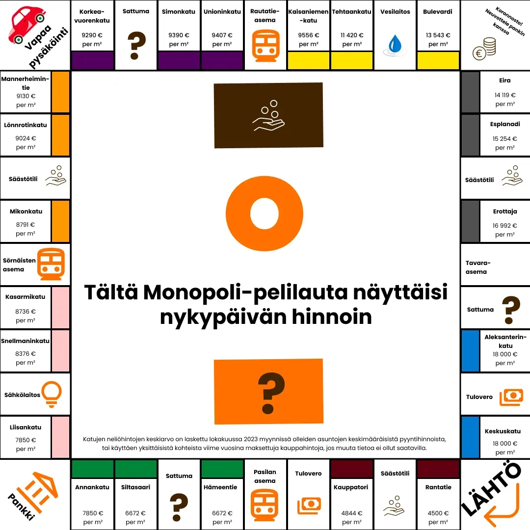 Tältä Monopoli-lauta näyttäisi nykypäivän neliöhinnoilla